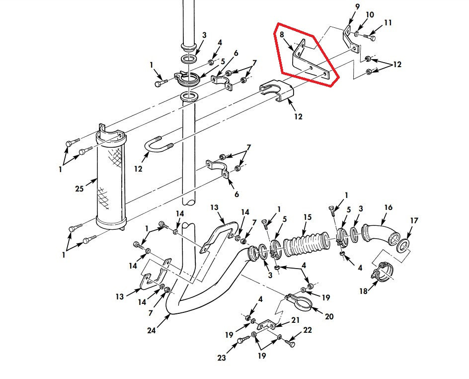 USED, TAKE OFF - EXHAUST STACK MAIN UPPER MOUNTING BRACKET FOR TURBO CHARGED M35A2 MODELS.